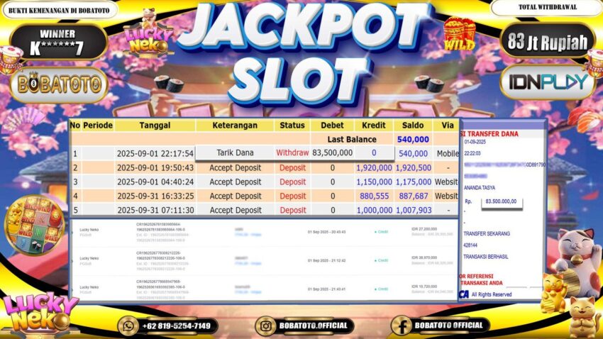 BOBATOTO – Selamat kepada User id :K******7 Telah berhasil mendapatkan kemenangan besar pada permainan SLOT LUCKY NEKO Dengan kemenangan Sebesar Rp.83,000,000-. Setelah mengisi formulir withdraw dengan kurung waktu hanya 5 – 10 menit pihak bobatoto sudah melakukan transfer kepada pemilik Userid dan dana sudah dapat di cairkan oleh pemenang. Bukti pembayaran yang kami berikan merupakan bukti pembayaran yang SAH / VALID yang langung di dapatkan melaui tanda transfer transaksi dari Bank yang di tuju.