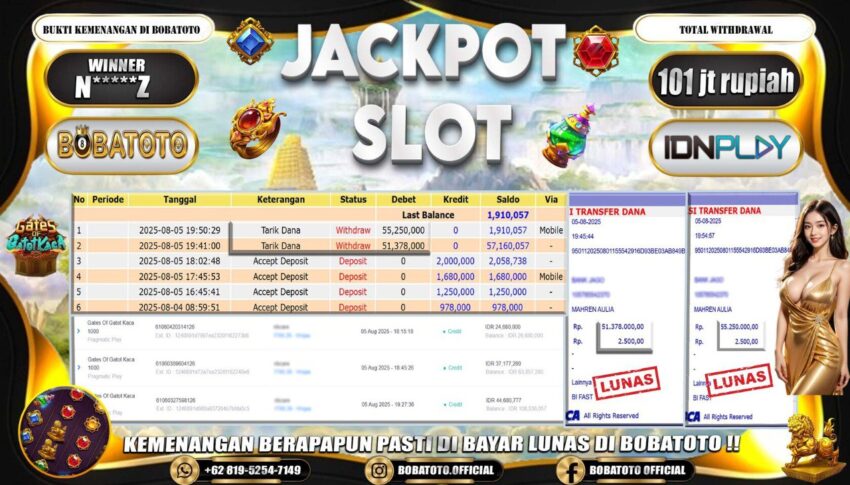 BOBATOTO – Selamat kepada User id : N*****Z Telah berhasil mendapatkan kemenangan besar pada permainan SLOT GATES OF GATOT KACA Dengan kemenangan Sebesar Rp.101,000,000,-. Setelah mengisi formulir withdraw dengan kurung waktu hanya 5 – 10 menit pihak bobatoto sudah melakukan transfer kepada pemilik Userid dan dana sudah dapat di cairkan oleh pemenang. Bukti pembayaran yang kami berikan merupakan bukti pembayaran yang SAH / VALID yang langung di dapatkan melaui tanda transfer transaksi dari Bank yang di tuju.