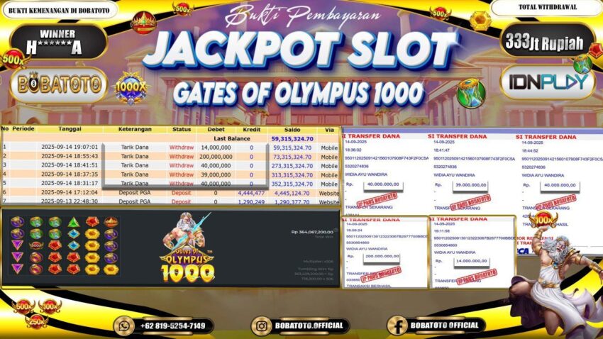 BOBATOTO – Selamat kepada User id : H******A Telah berhasil mendapatkan kemenangan besar pada permainan SLOT PRAGMATIC GATES OF OLYMPUS 1000 Dengan kemenangan Sebesar Rp.333,000,000,-. Setelah mengisi formulir withdraw dengan kurung waktu hanya 5 – 10 menit pihak bobatoto sudah melakukan transfer kepada pemilik Userid dan dana sudah dapat di cairkan oleh pemenang. Bukti pembayaran yang kami berikan merupakan bukti pembayaran yang SAH / VALID yang langung di dapatkan melaui tanda transfer transaksi dari Bank yang di tuju.