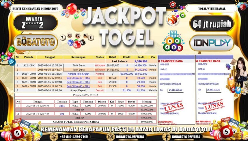 BOBATOTO – Selamat kepada User id : Z*****2 Telah berhasil mendapatkan kemenangan besar pada permainan TOGEL CHINA Dengan kemenangan Sebesar Rp.64,000,000,-. Setelah mengisi formulir withdraw dengan kurung waktu hanya 5 – 10 menit pihak bobatoto sudah melakukan transfer kepada pemilik Userid dan dana sudah dapat di cairkan oleh pemenang. Bukti pembayaran yang kami berikan merupakan bukti pembayaran yang SAH / VALID yang langung di dapatkan melaui tanda transfer transaksi dari Bank yang di tuju.