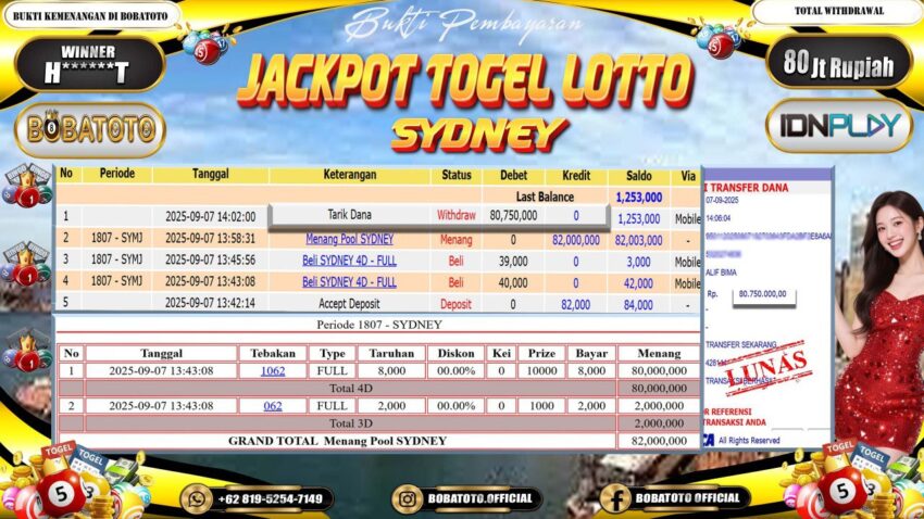 BOBATOTO – Selamat kepada User id : H******T Telah berhasil mendapatkan kemenangan besar pada permainan TOGEL SYDNEY LOTTO Dengan kemenangan Sebesar Rp.80,000,000,-. Setelah mengisi formulir withdraw dengan kurung waktu hanya 5 – 10 menit pihak bobatoto sudah melakukan transfer kepada pemilik Userid dan dana sudah dapat di cairkan oleh pemenang. Bukti pembayaran yang kami berikan merupakan bukti pembayaran yang SAH / VALID yang langung di dapatkan melaui tanda transfer transaksi dari Bank yang di tuju.